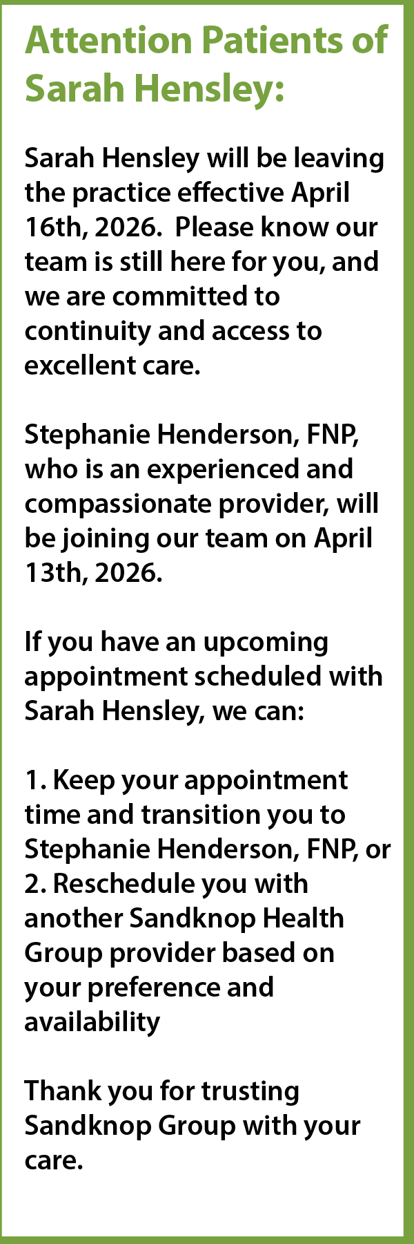 We are looking forward to seeing you! Please help us share our new Facebook Page with your family and friends. https://www.facebook.com/Sandknop-Health-Group-Family-Practice-1156190034518992/